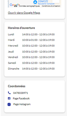 Vos coordonnée clairement présentées sur une carte Google intégrée, en plus des horaires et d’autres informations.