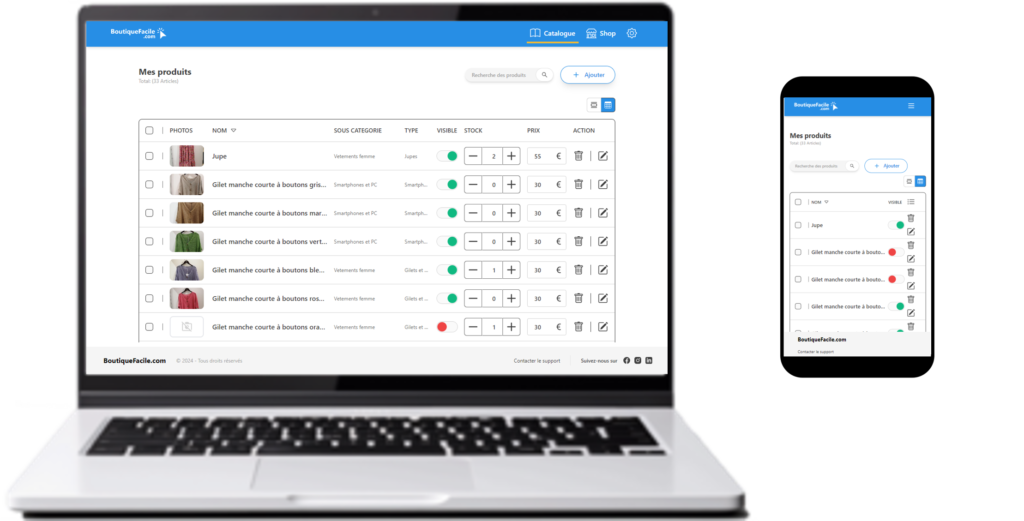 Votre site boutique est toujours parfaitement accessible, que ce soit sur un ordinateur de bureau, une tablette ou un smartphone. Avec une expérience utilisateur fluide, vos clients peuvent explorer et commander en toute simplicité où qu’ils soient.