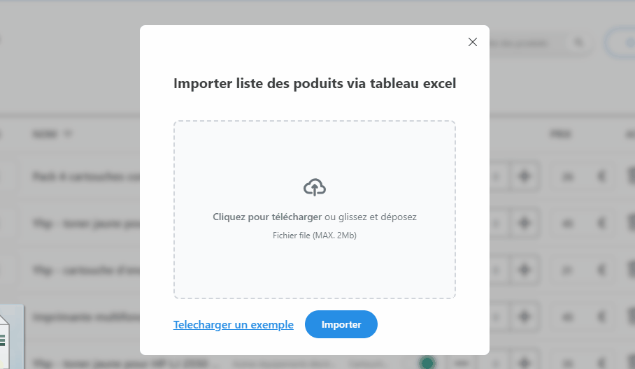 Pour rajouter des articles vous avez le choix soit de rentrer un article à la fois, soit importer un tableau Excel de plusieurs dizaines d'articles et de photos, il suffit de suivre les consignes pour organiser votre catalogue produits